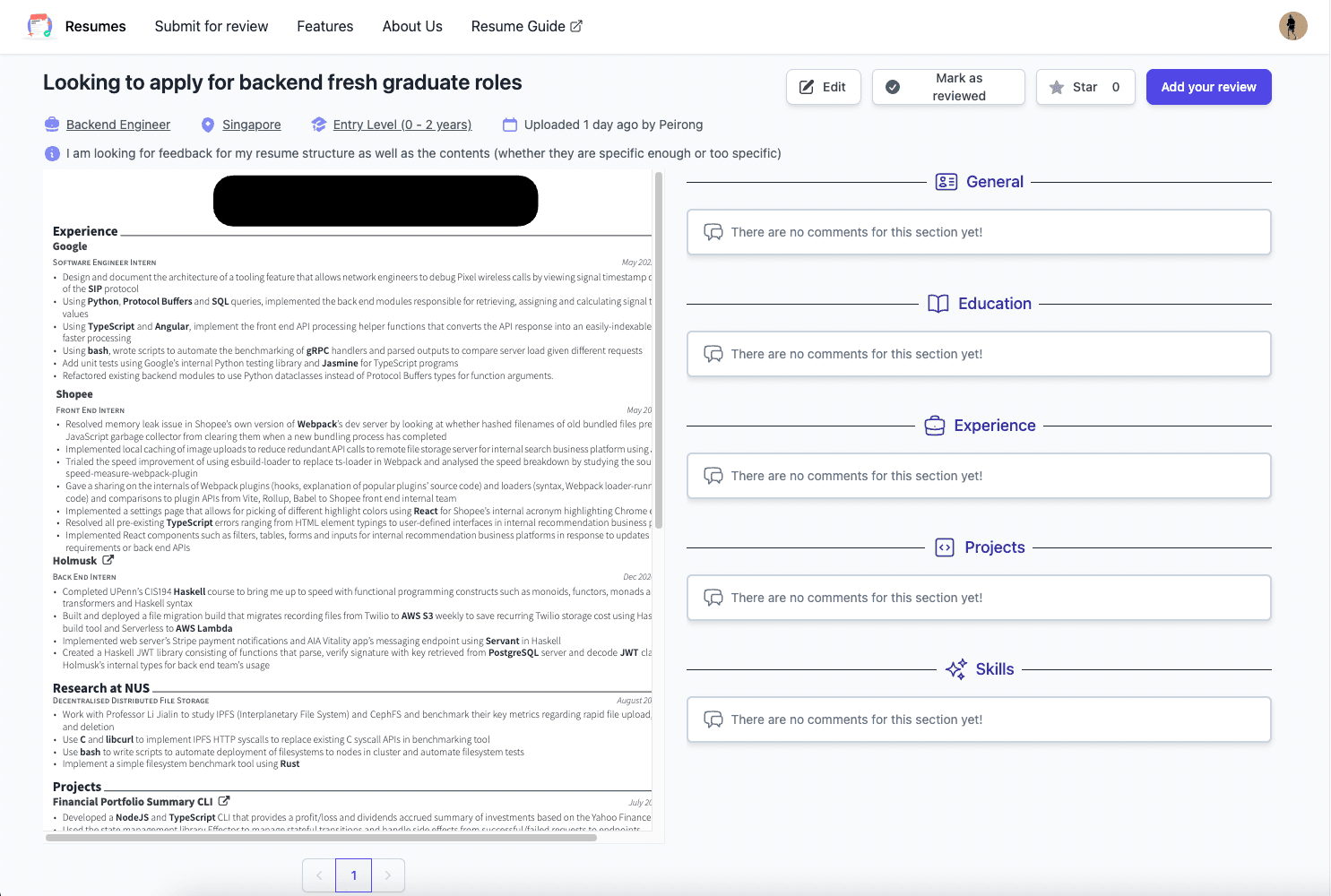 Get valuable feedback from the public or checkout reviewed resumes from your fellow engineers